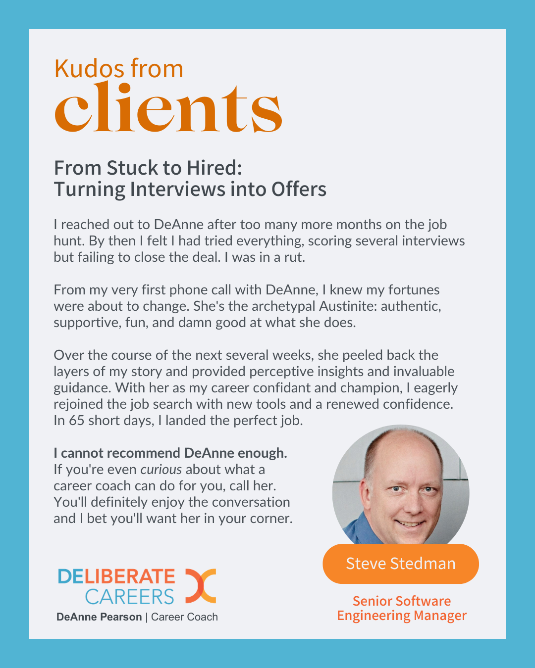 Steve Stedman and I connected because he needed a reboot on his job search. After creating an outstanding product with his team for PayPal, the company moved the product to CA, closer to the "mothership." Since Steve wanted to stay in Austin, he needed to find a local opportunity, but he wasn't getting the traction that he desired with his job search. So we reworked the job search strategy, and he started getting interviews. We refined his approach to interviews, stories, and habits that showed the best of his skills, knowledge, achievements, and talents. His confidence started to shine through. He is now at Athena Health and too busy to return my calls, which is terrific!